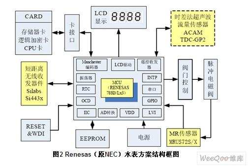 水表的電源一般由水表自行供給,這就對(duì)水表的功耗提出了苛刻的要求。國(guó)際規(guī)定,智能水表的靜態(tài)電流應(yīng)該小于30μA,實(shí)際中水表廠商都把該指標(biāo)控制在10μA以?xún)?nèi)(使用干簧管傳感器時(shí)),保證工作時(shí)間大于6年以上才算合格。NEC帶LCD控制功能的8位微控制器以其低功耗、高性能等優(yōu)勢(shì),成為水表微控制器的優(yōu)質(zhì)選擇。 1 NEC山梨MR和Renesas MCU水表方案 該方案的工作原理為:在葉輪上裝上磁鐵,由磁場(chǎng)感應(yīng)器(MR Sensor)感知出葉輪的旋轉(zhuǎn)。磁場(chǎng)感應(yīng)器(MR Sensor)把磁場(chǎng)信號(hào)轉(zhuǎn)變成電信號(hào),再由單片機(jī)進(jìn)行計(jì)量的加法或減法運(yùn)算,運(yùn)算值由液晶顯示或?qū)ν獠枯敵。如圖1所示
